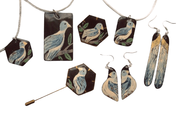 Smaltovaná souprava s modrými holubicemi. Velký výběr různých velikostí a tvarů šperků, z nichž lze vybrat kombinaci pro různé příležitosti. Sestavte si vlastní kombinaci.