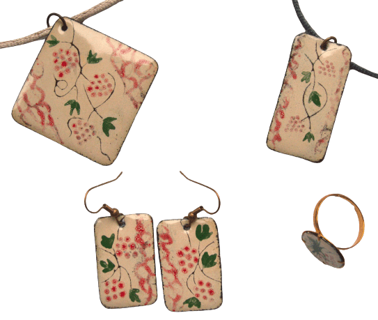 Smaltovaná souprava s růžovými hrozny inspirovaná krojem mělnického folklórního souboru. Sestavte si vlastní kombinaci šperků pro různé příležitosti.