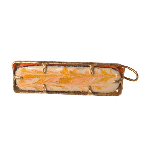 Smaltovaná zlatobéžová sponka. Ladí k blond vlasům. Je vhodná k sepnutí části vlasů nebo pro děti. Sluší jarnímu typu. Dolaďte ji náušnicemi nebo náhrdelníkem ve stejných barvách.