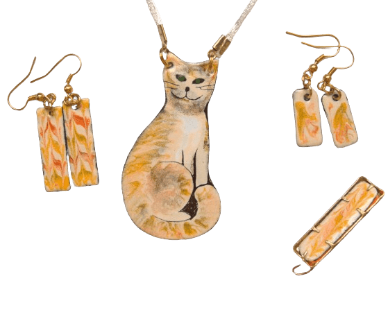 Smaltovaná zlatobéžová souprava. Dominuje jí velký náhrdelník s kočkou. Sluší jarnímu typu. Vyberte si vlastní kombinaci.