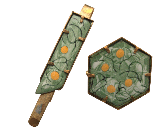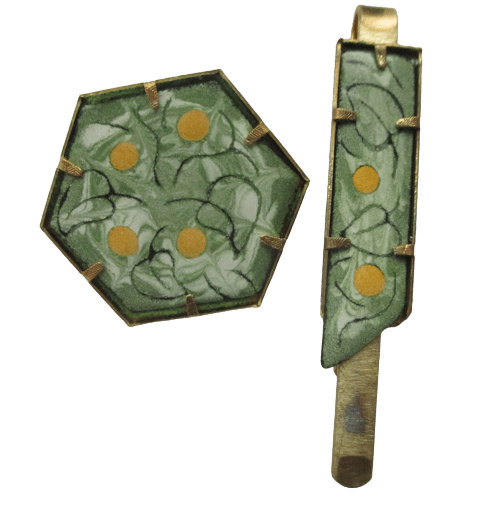 Zelenkavá smaltovaná souprava. Dámská brož a pánská spona do kravaty s jemným lístečkovým vzorem. Hodí se pro slavnostní příležitosti a pro páry, které ladí své oblečení a doplňky do posledních detailů. Sluší jarnímu typu.