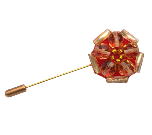 Žlutá korálková jehlice do klopy. Nápadný doplněk bude ladit k výrazné kravatě nebo kapesníčku. Pro Váš dámský doprovod nabízím náušnice ze stejných korálků.