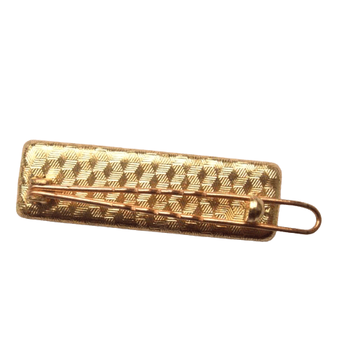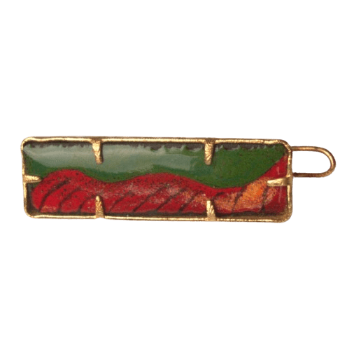 Červenozelená smaltovaná sponka. Sluší jarnímu typu. Můžete s ní sepnout menší množství vlasů, nebo ji připnout nad culík. Doplňte ji náušnicemi nebo přívěskem s papoušky ve stejných barvách.