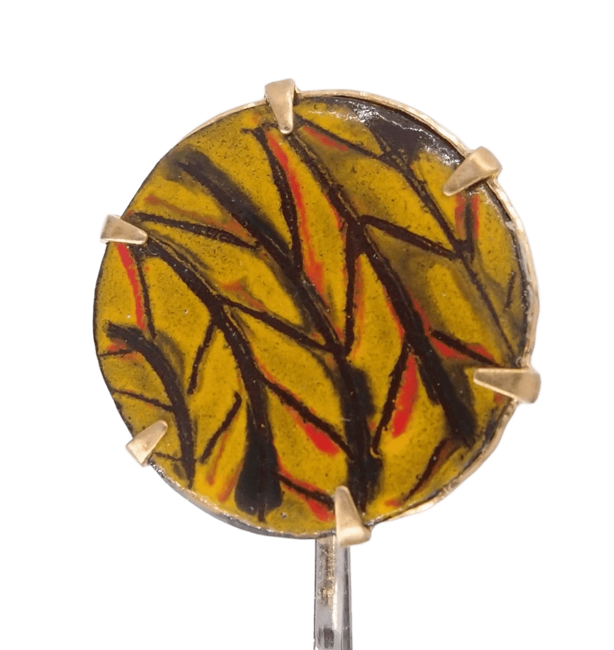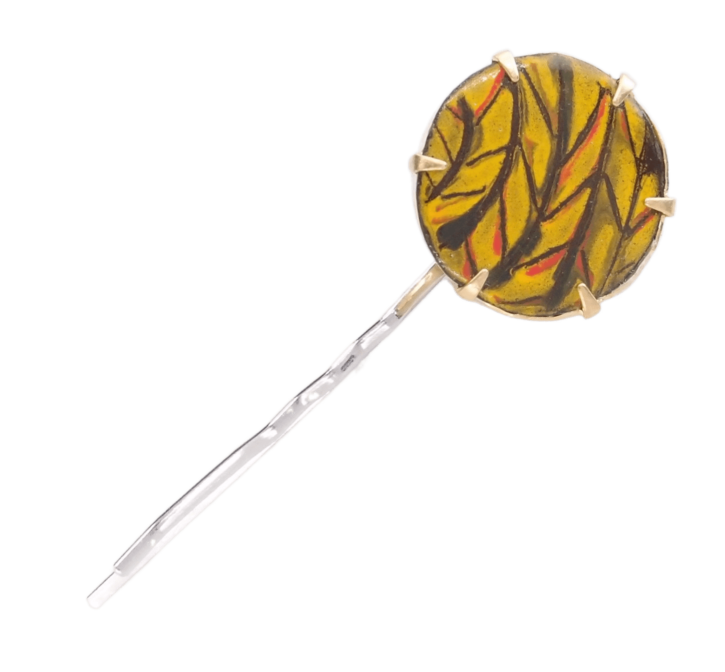 Smaltovaná žlutě pruhovaná sponka. Tato smaltovaná sponka se žlutými pruhy je skvělým doplňkem pro tmavší vlasy, kde krásně vynikne. Její pevné perko zaručuje, že sponka bezpečně drží na místě a neklouže, což ji činí ideální volbou pro každodenní nošení i speciální příležitosti. Pro dokonalý vzhled ji můžete sladit s broží ve tvaru motýla, přívěskem nebo náušnicemi ve stejných žlutých odstínech, čímž vytvoříte harmonický a elegantní set.