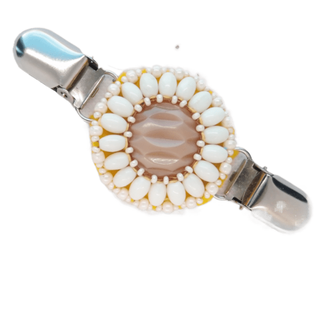 Béžová korálková oděvní spona. Jemný a univerzální doplněk, který krásně ladí s jarním typem a smetanovými doplňky. Svými neutrálními tóny se hodí k šátkům, lehkým plédům či šálům přes kabát. Minimalistický design umožňuje snadné kombinování s dalšími doplňky a šperky, aniž by rušil celkový vzhled.
