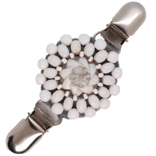 Bílá korálková oděvní spona. Jemný, romanticky působící doplněk s vintage knoflíkem s plastickým reliéfem. Díky své neutrální barevnosti je spona velmi univerzální a snadno se kombinuje s nejrůznějšími outfity od lehkých svetříků až po elegantní plédy či šátky. Působí něžně, ale zároveň upraveně a skvěle doplní romantický i minimalistický styl. Můžete ji dobře kombinovat se stříbrnými šperky.