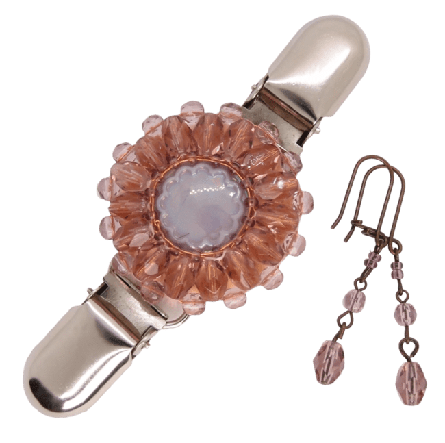 Fialová korálková oděvní spona s broušenými korálky, skleněným knoflíkem a meruňkově růžovým podšitím.