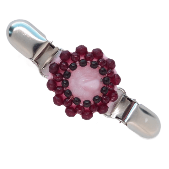 Růžovovínová korálková oděvní spona. Menší, romantický doplněk. Hodí se skvěle k sepnutí plédu přes společenské šaty, lehkého šátku či svetrů a podtrhuje elegantní a ženský vzhled. Je ideální pro ty, kteří hledají působivý šperk, který doplní romantický styling.